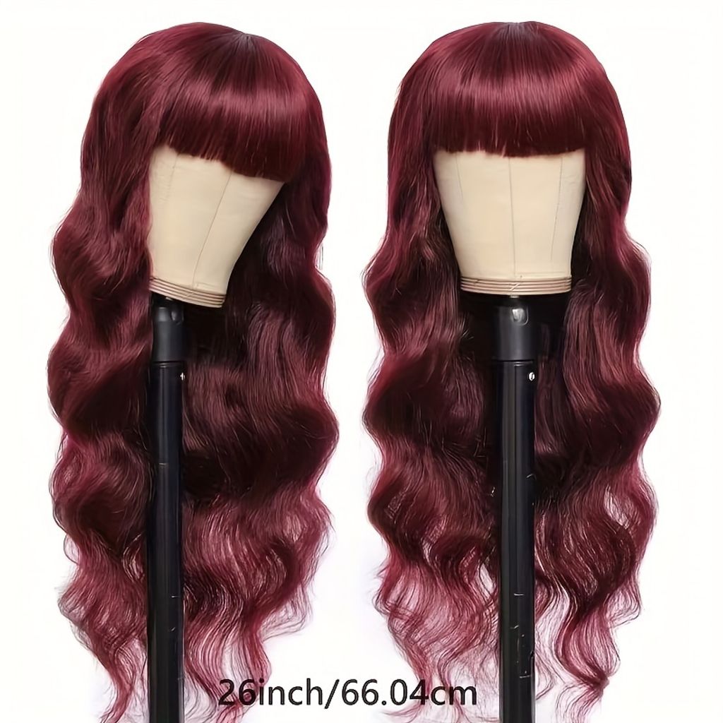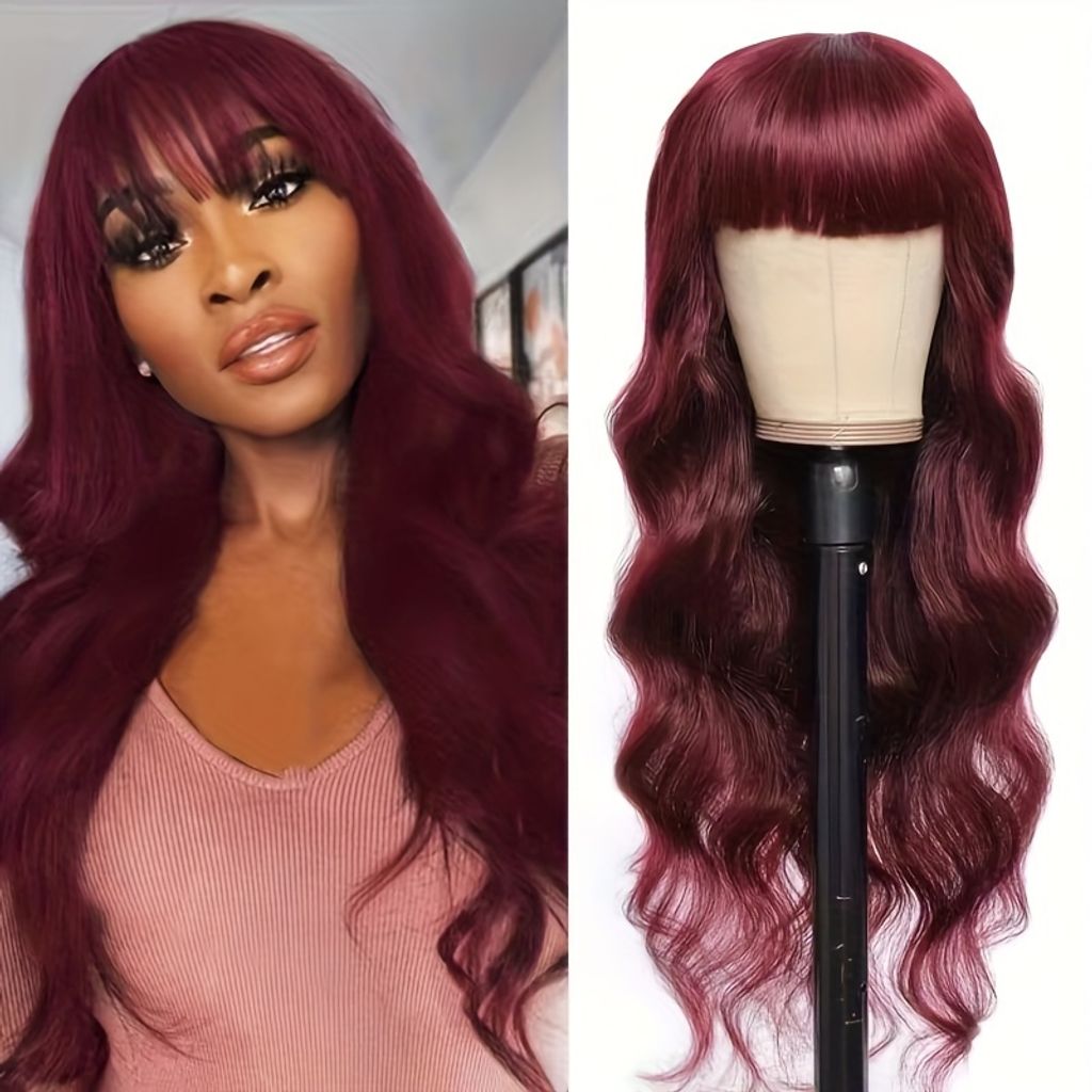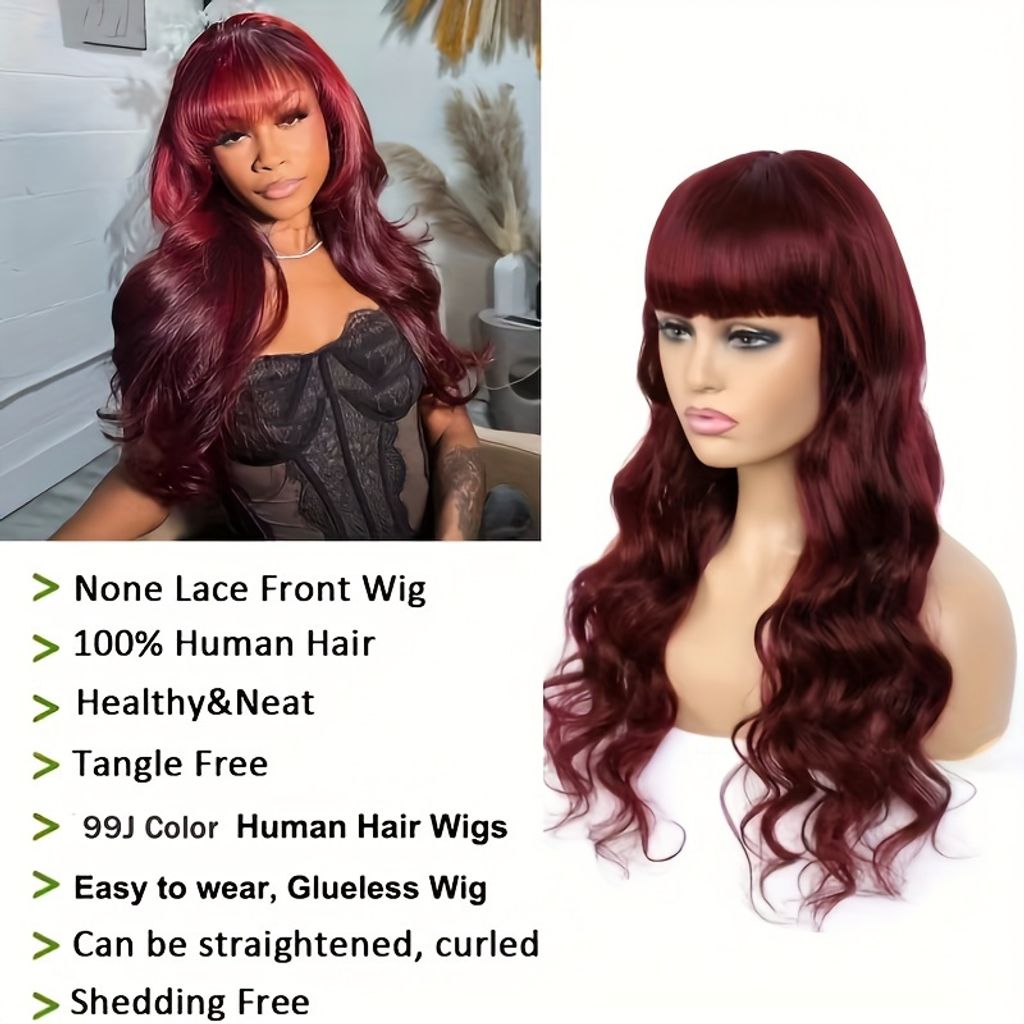 250% Density Glueless Body Wave Wig With Bangs Human Hair Wig Burgundy Color 100% Brazilian Human Hair Wig 99J Machine Made No Lace No Glue Realastic Scalp For Beginners