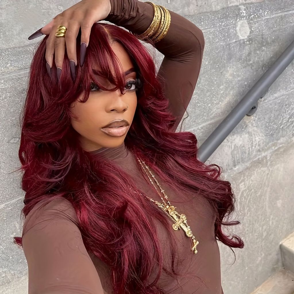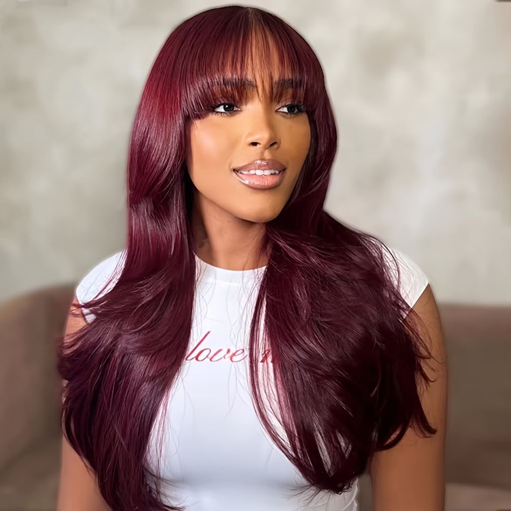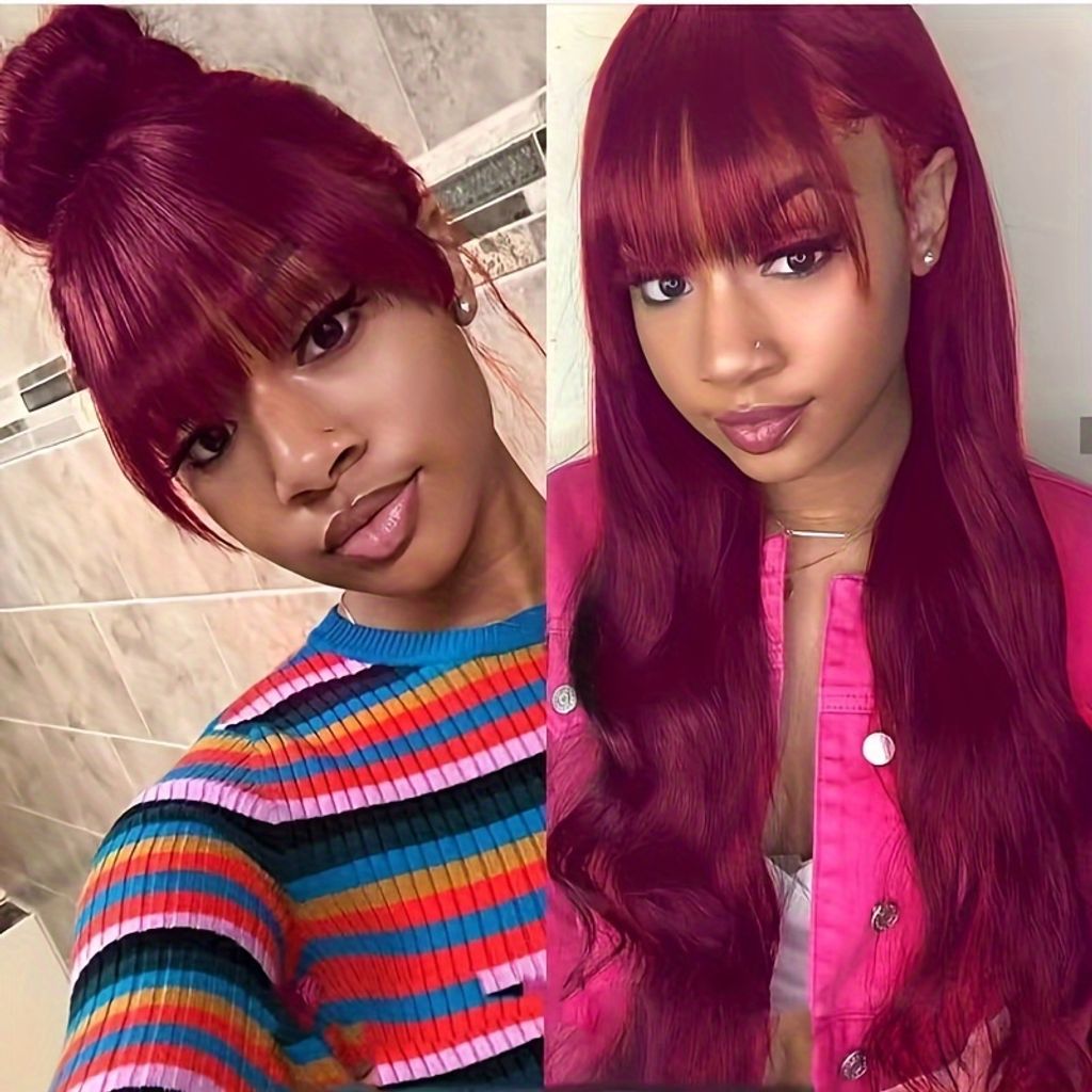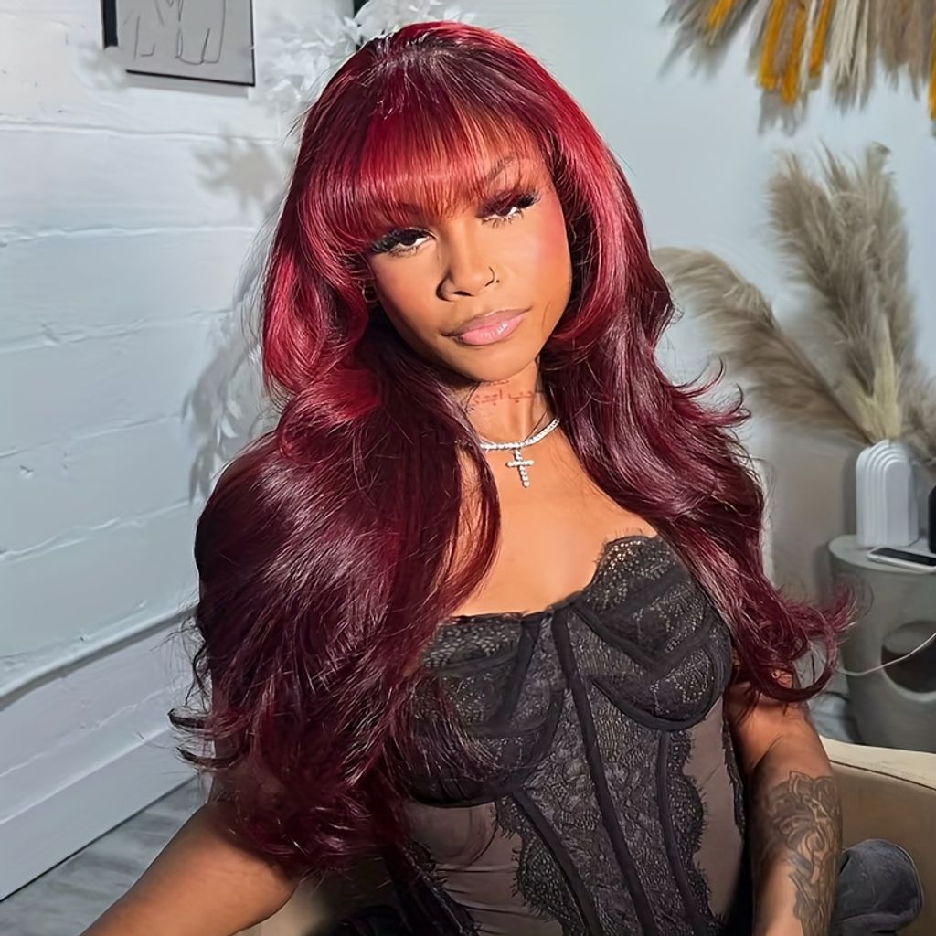 250% Density Glueless Body Wave Wig With Bangs Human Hair Wig Burgundy Color 100% Brazilian Human Hair Wig 99J Machine Made No Lace No Glue Realastic Scalp For Beginners