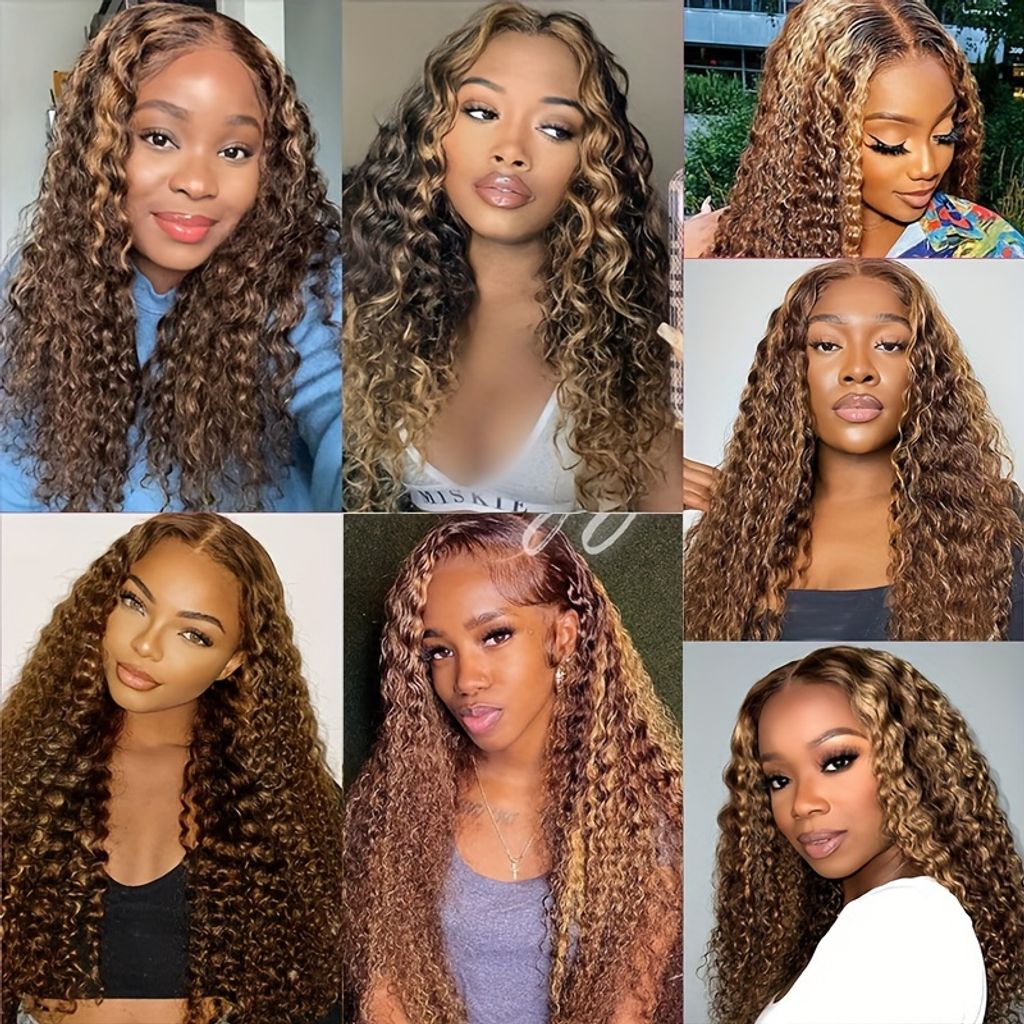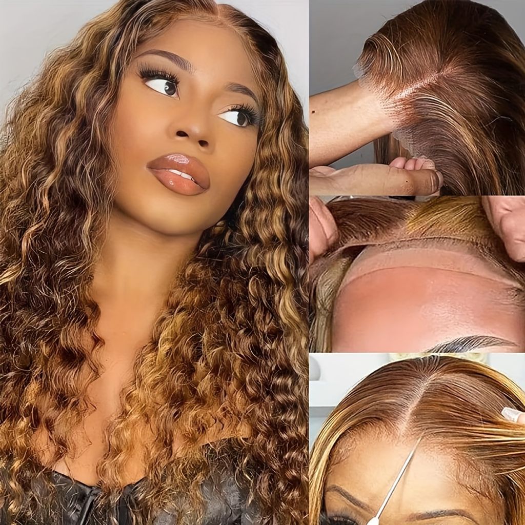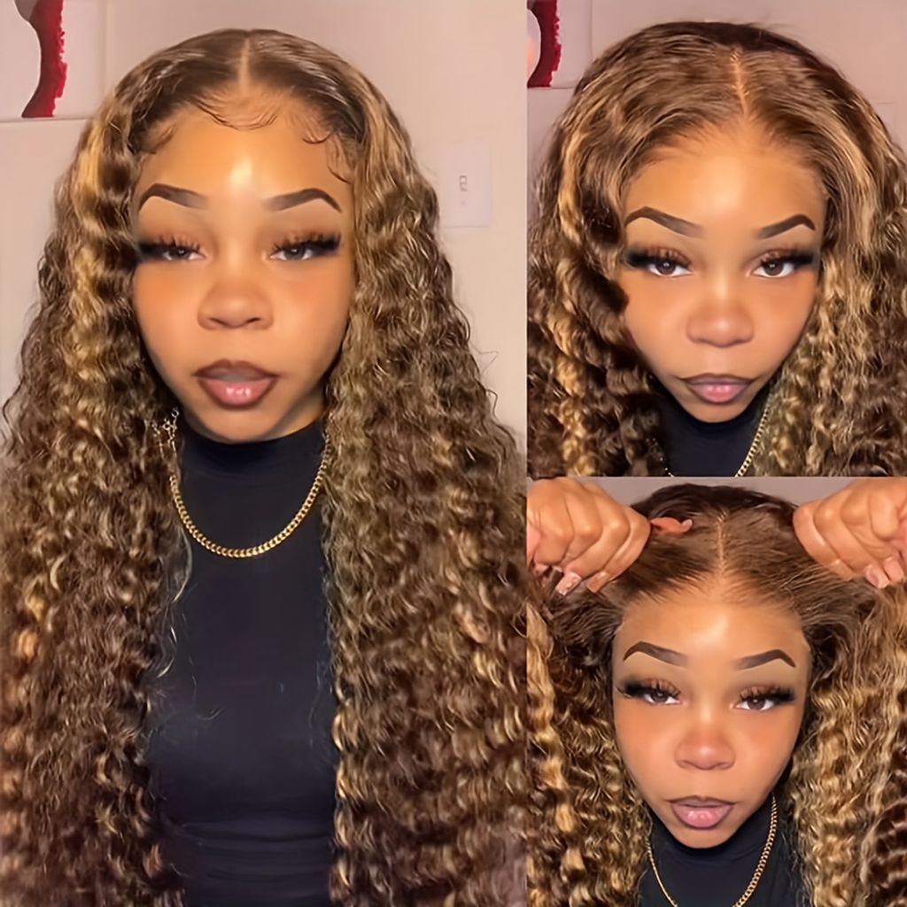 Glueless Wig Water Wave Lace Front Wigs Human Hair Ombre Brown Mix Highlight Honey Blonde Colored 4/27 Wig 5x5 HD Transparent Lace Closure 180% Density Full&Thick Hair
